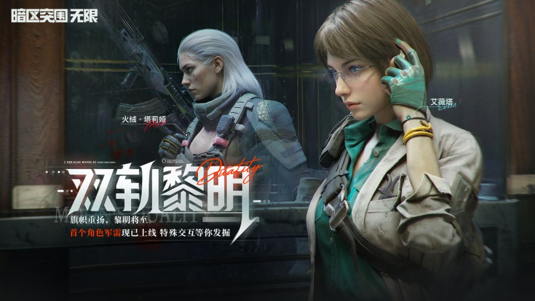 参与「双轨黎明」军需活动,即有机会获得《暗区突围:无限》首次推出的军需角色「艾薇塔」与「火绒·塔莉娅」,活动上架期间,消耗「双轨黎明军需卡」即可参与「双轨黎明」主题军需活动,每次参与都能获得奖励,包括金色品质枪械涂装,专属主题头像、挂饰等,集齐核心奖励还可获得独家档案外观。