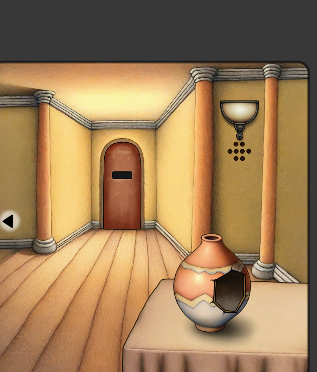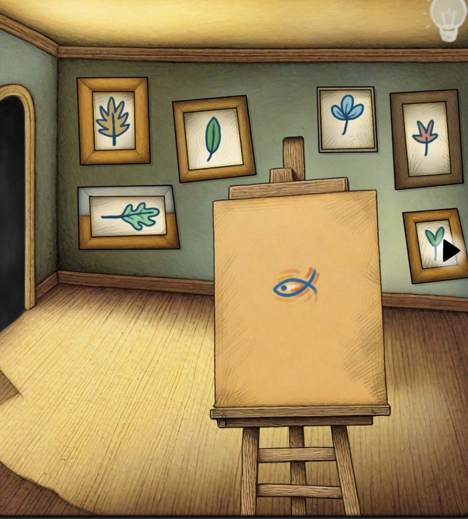 进去后得到笔刷,用刀把小鱼割下来,墙上树叶角数是另一扇门的密码