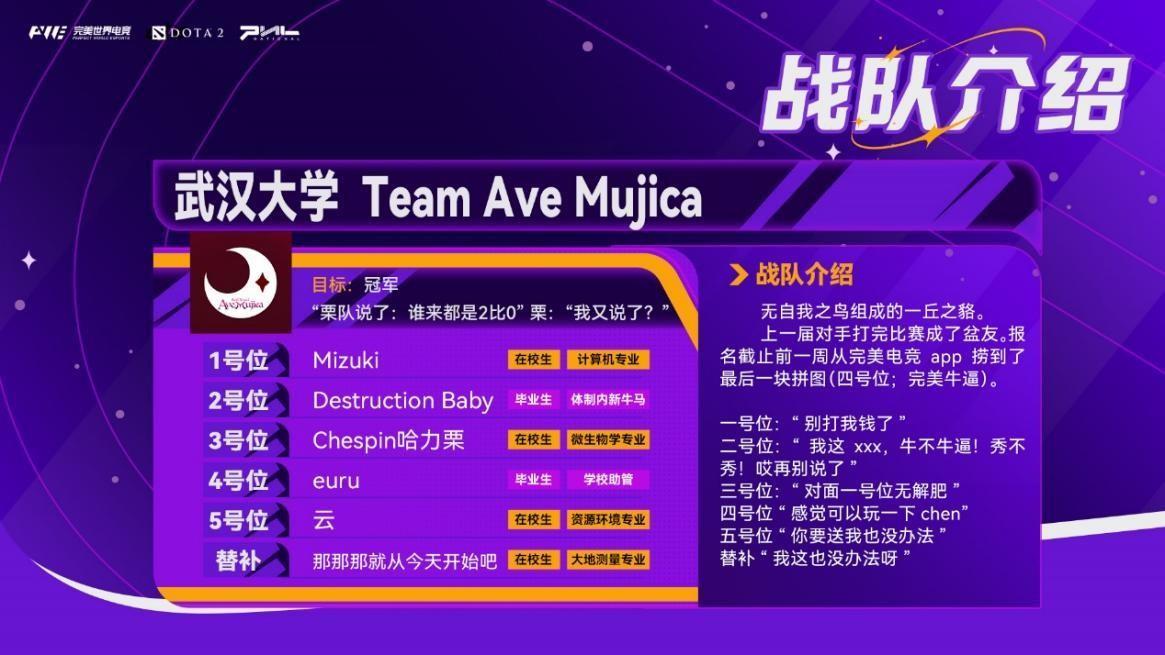 武汉大学Ave Mujica的海选战绩同样耀眼,从海选开始他们就一直保持全胜,直到遇见了上面那支队伍。在胜者组决赛,武汉大学Ave Mujica 0-2负于电子科技大学不高兴战队,并且第一局在有望获胜的情况下胜利。“我从来没有觉得打比赛开心过”,“为什么要对着刃甲大锤输出”,“全都不会玩”——他们并没有说出这样的话,而是在败者组完成蜕变,重回决赛舞台。
