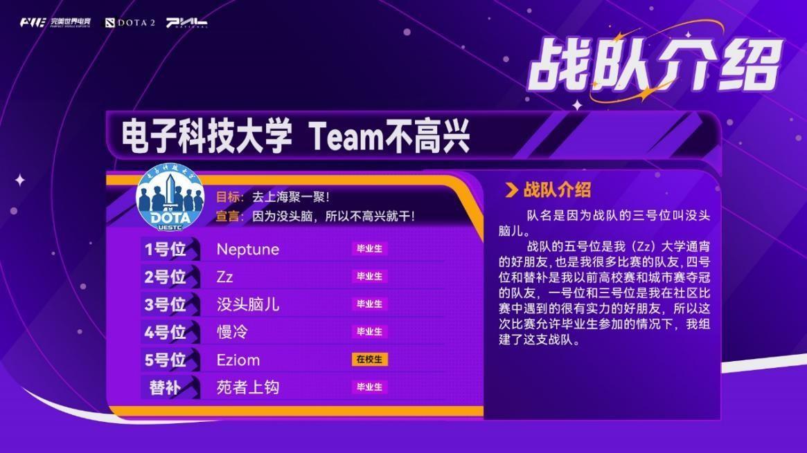 电子科技大学不高兴战队从海选开始就强势无比,整个赛事期间仅在海选出线战Bo3中输掉一个小局,场均比赛时间仅30分钟出头。没错,你上一节课的功夫他们就会赢下一场比赛还能上个厕所顺便把下一局的BP想好。如此强大的校友队伍,他们还在不高兴什么呢?大抵只是相见恨晚罢!