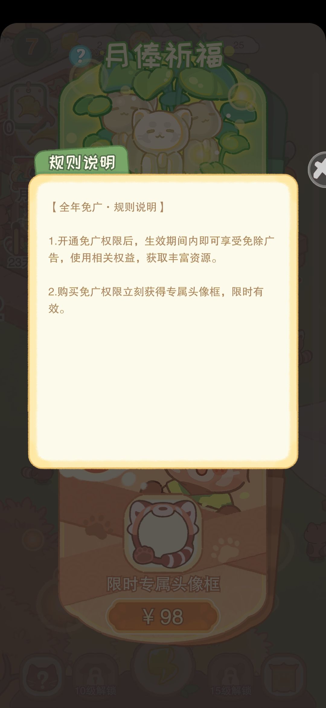 月卡跟年卡,我真不明白了,你一个偏单机的小游戏,98居然不是永久卡,年卡也就只包含一年免广跟一个头像框,连点玉都舍不得塞进去,我真服了,像是上线后割一波就跑的节奏
