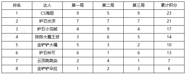 在积分赛阶段(12月22‑25日),8位达人通过BO1赛制激烈争夺积分,最终炉石炎凉、CS海胆、炉石小浣熊、金铲铲大橘四位选手脱颖而出,晋级今晚(12月26日19:00)决赛。决赛将采用BO3赛制,这四位晋级达人将挑战魔王团的四位强敌:云顶跳跳染、金铲铲朵拉、陈陈大魔王、炉石林可,争夺“大棋业家”称号并赢取6666元“团鉴”奖金。
