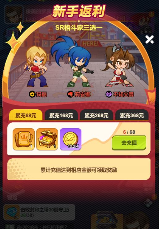 另外在游戏中我们也需要注意新手返利这个活动,这个是前期非常重要的角色来源,在累充达到68/168/268/368元的时候,可以分别领取1/1/2/2,共计6张格斗家自选卡,这里能从玛丽、丽安娜和不知火舞三个角色中选定一个,这里我会比较推荐玛丽和不知火舞,一个是前排超级抗伤,一个是后排爆发输出,搭配首充的八神庵基本阵容就成型了。