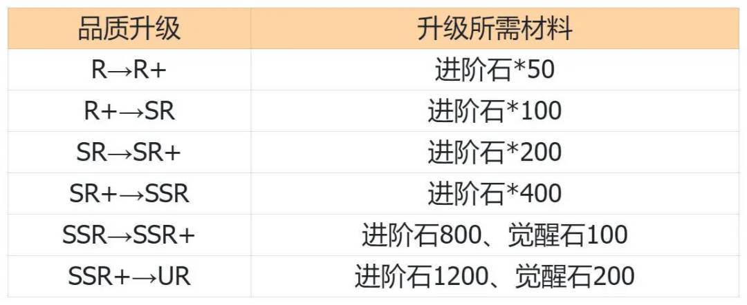 首先我们来看进阶石的升级消耗,下面列举了从R到UR品质升级消耗的数量,即一个R级英雄升到UR品质需要2750个进阶石,而且从SSR级开始需要额外消耗觉醒石材料。
