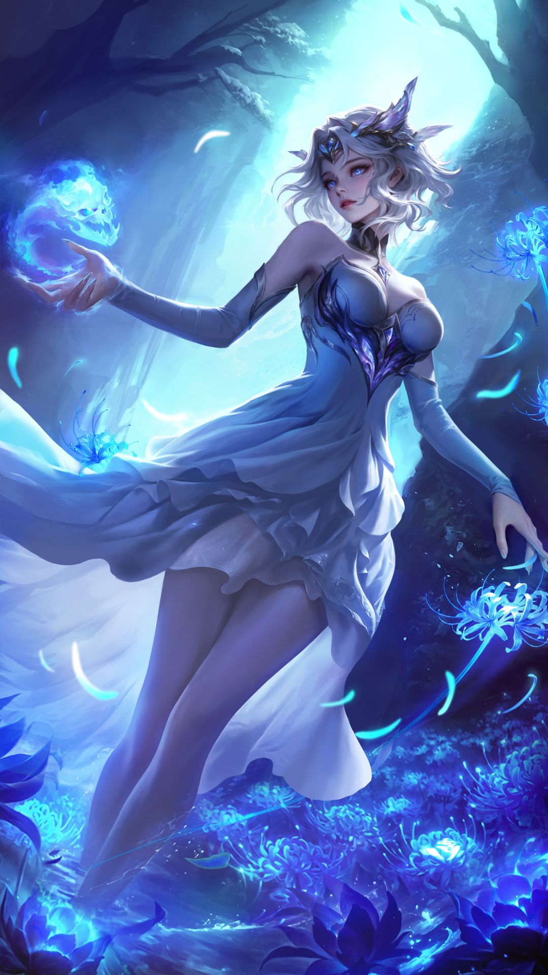长夜之下,雪覆盖了宫殿外的冥原。河面冻结,彼岸花的蓝色在冰霜中显得愈发幽深。
