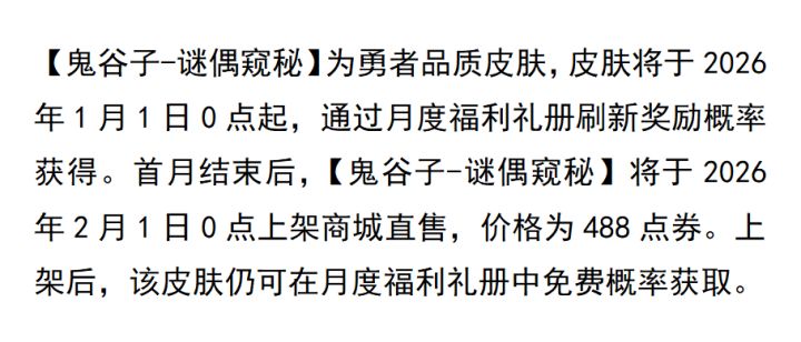【鬼谷子-谜偶窥秘】为勇者品质皮肤,皮肤将于2026年1月1日0点起,通过月度福利礼册刷新奖励概率获得。