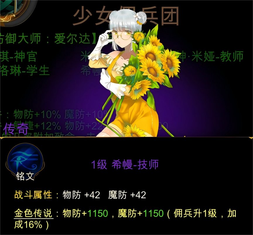 金色传说:物防+1150,魔防+1150(佣兵升1级,加成16%)。