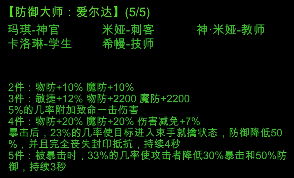 5件套属性:被暴击时,33%的几率使攻击者降低30%暴击和50%防御,持续3秒