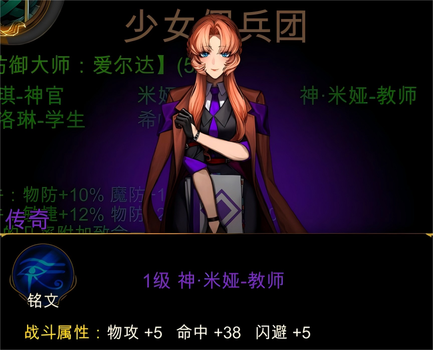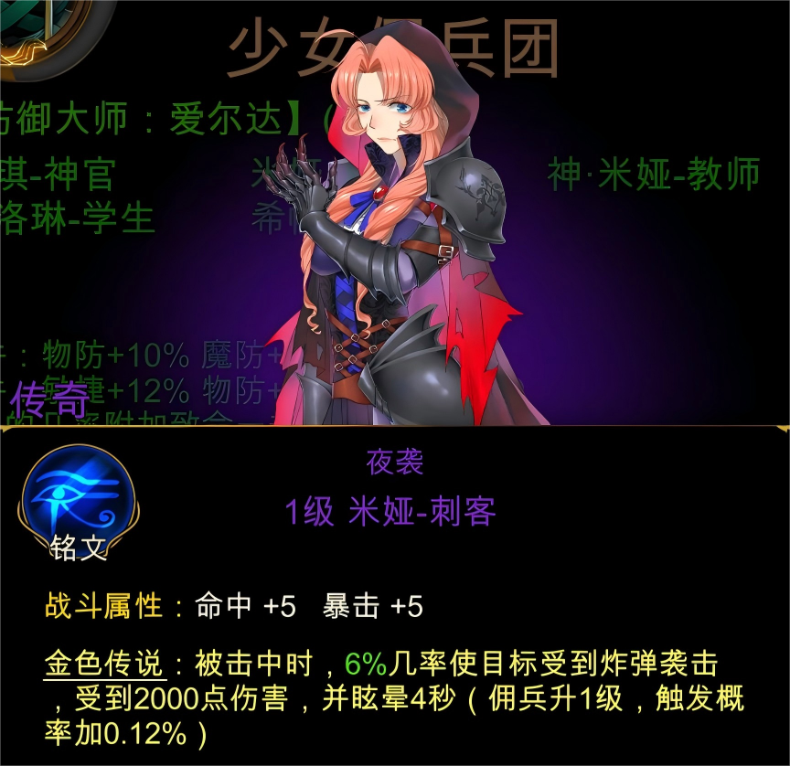 教师-米娅仅有战斗属性加成,没有金色传说属性加成,在这个佣兵组中的作用相对较小,等级提升的优先级可以放在最后。