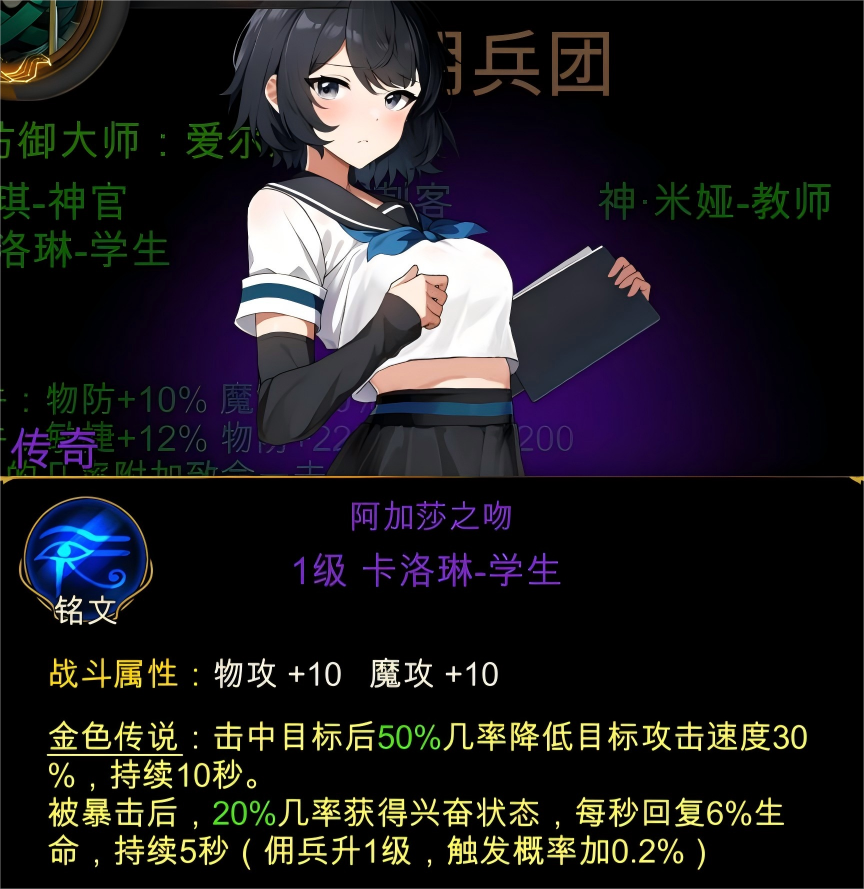 金色传说:击中目标后50%降低目标的攻击速度30%,持续10秒。被暴击后,20%几率获得兴奋状态,每秒回复6%生命,持续5秒(佣兵升1级,触发概率加0.2%)。