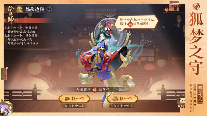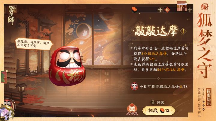 ※大人在「敲敲达摩」玩法中可获得达摩蛋,将达摩蛋放置在「积运存福」中即可自动合成高级达摩蛋,并获得相应福气值。在「福来运转」玩法中投递或抽取信件也可以获得福气值。