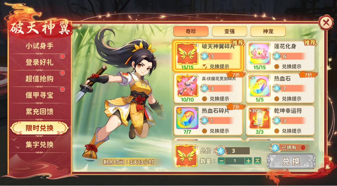 奇珍异宝开放兑换,破天神翼限时返场。还有莲花化身、热血石等高价值奖励一并上架,机会难得不可错过