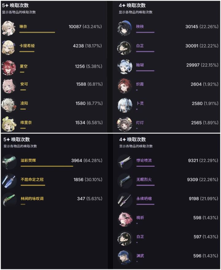 《鸣潮》3.0版本于昨日开启,新五星角色琳奈与复刻角色卡提希娅、夏空进入卡池。根据首日统计,琳奈的抽取数量显著领先,共出货10087只,卡提希娅出货4238只,夏空出货1256只,卡提希娅与夏空的抽取数合计约为琳奈的一半;在武器抽取方面,琳奈的专属武器获取数量也高于两位复刻角色的专武总和,琳奈专武出货3964把,卡提希娅专武出货1856把,夏空专武出货347把(如图二)。