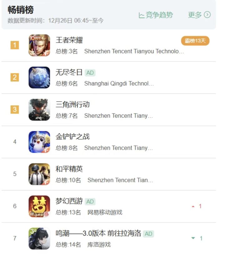从市场排名看,该卡池推动《鸣潮》在iOS国服游戏畅销榜位列第七(如图三),在日本与韩国市场分别排名第五和第四。