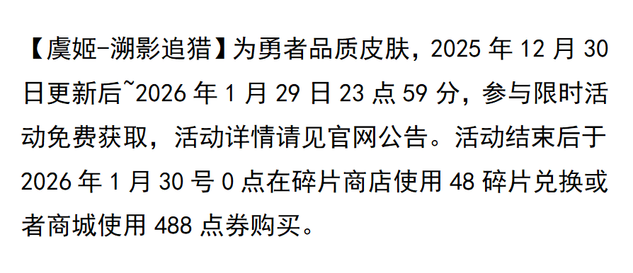 【虞姬-溯影追猎】为勇者品质皮肤,2025年12月30日更新后~2026年1月29日23点59分,参与限时活动免费获取,活动详情请见官网公告。