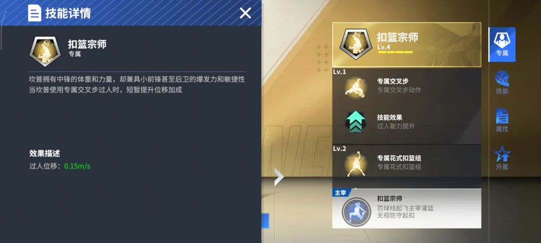 1级专属:解锁坎普专属交叉步动作,同时增加坎普的过人位移。相较于其他扣将,坎普的第一步更让对方猜不透,交叉步迅捷突破的同时增加0.15m/s的过人位移,突破就在一瞬间!