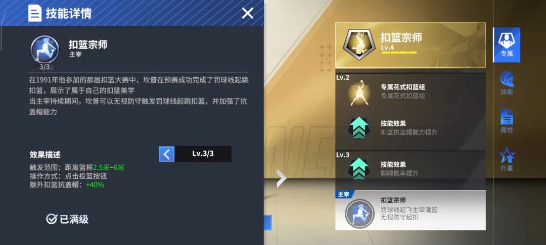 2级专属:解锁坎普专属花式扣篮组,增加专属扣篮抗盖帽概率20%!旁人看来难如登天的篮筐,在坎普眼里正是绝佳的舞台!过掉对方后展示不同扣篮动作,迷惑对手的同时也将吸引全场目光!论及扣篮,坎普又何尝不是靓仔!