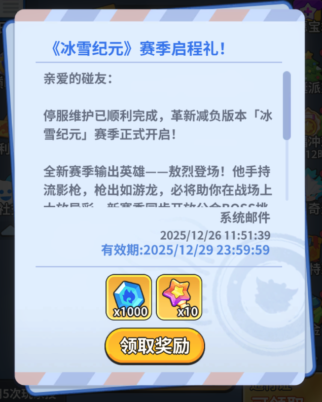 是谁还没收到这份兑换码福利?现在复制下方兑换码,前往游戏内进行兑换,即可领取赛季礼包一份:祈愿水晶*30、金币*1000、天赋碎片Ⅰ*300。
