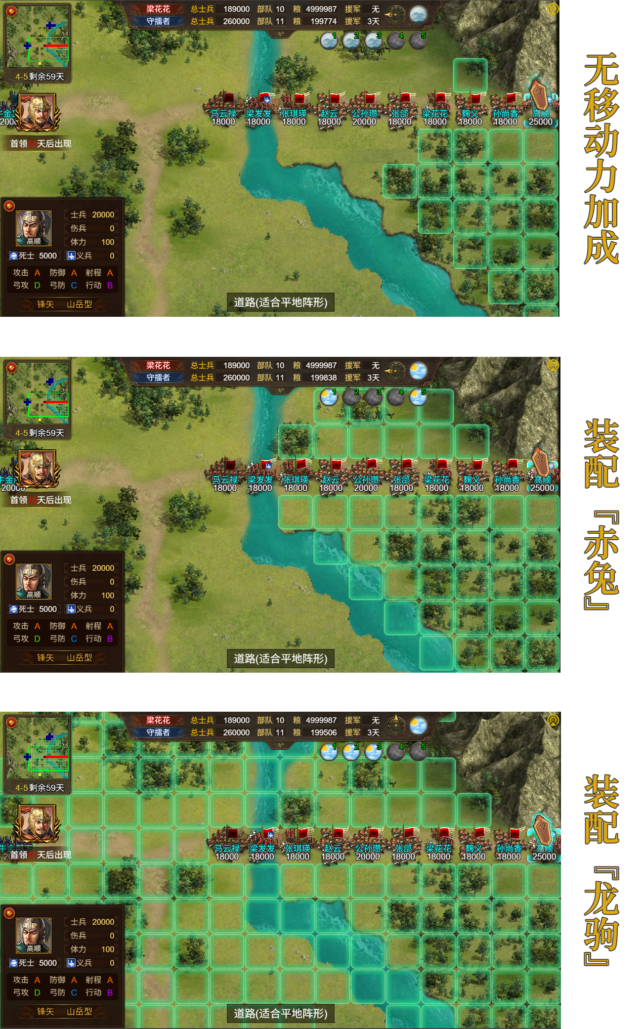 也就是说,龙驹可借由友军的位置,大幅提升行动范围!实机移动力对比如下: