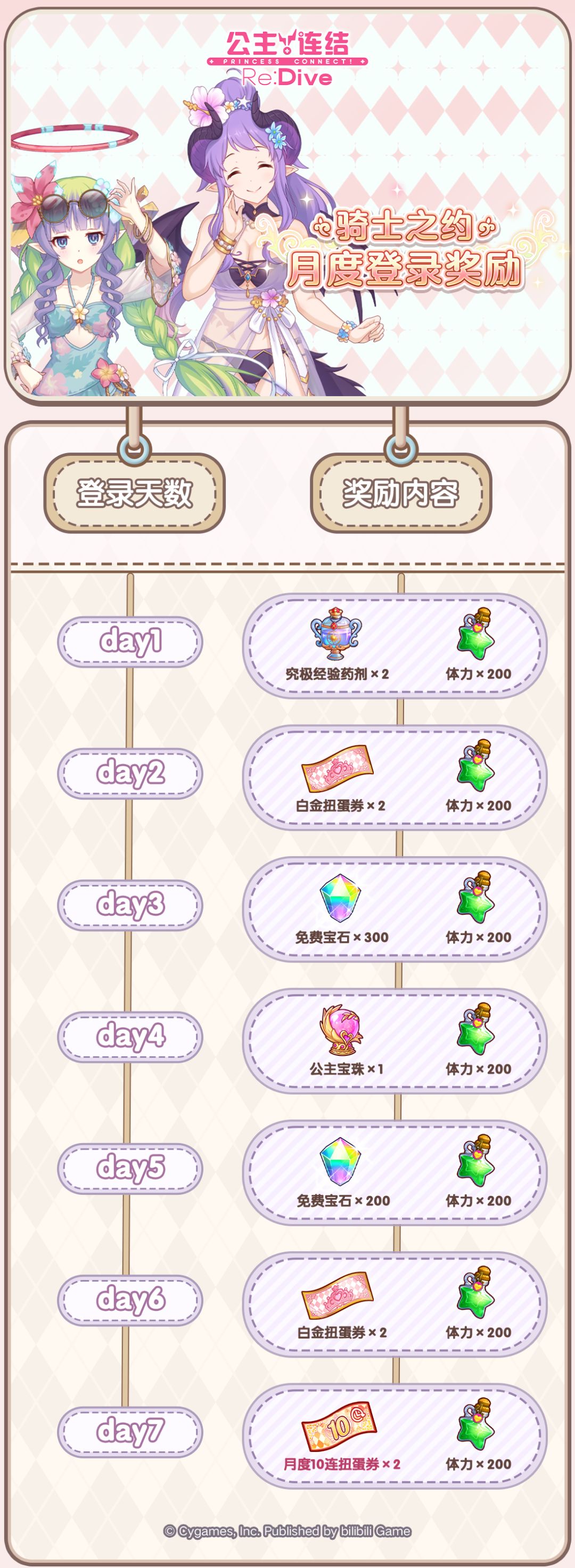 6. 「骑士之约」月度登录活动内容如有变更,我们将第一时间于各大官方社交账号告知大家,欢迎骑士君们关注我们的官方微博、微信和动态(公主连结ReDive)。