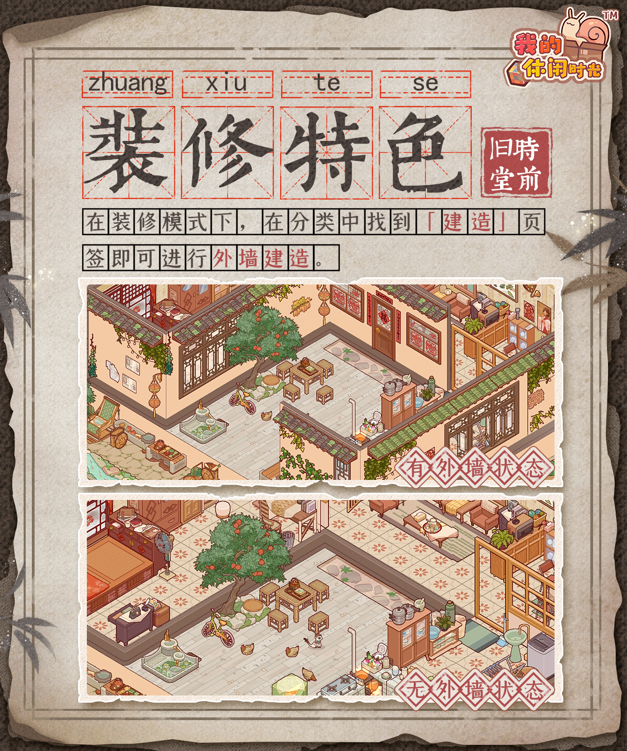 ⭐️全新特殊户型「旧时堂前」即将上架猫头鹰商店!1月3日0点-1月31日23:59期间,累计在猫头鹰商店购买商品次数达40次时即可免费领取。在该户型中,小蜗们可以建造外墙,还有特殊的斑驳光影效果和落叶飘扬动态效果!感兴趣的小蜗千万别错过哟~