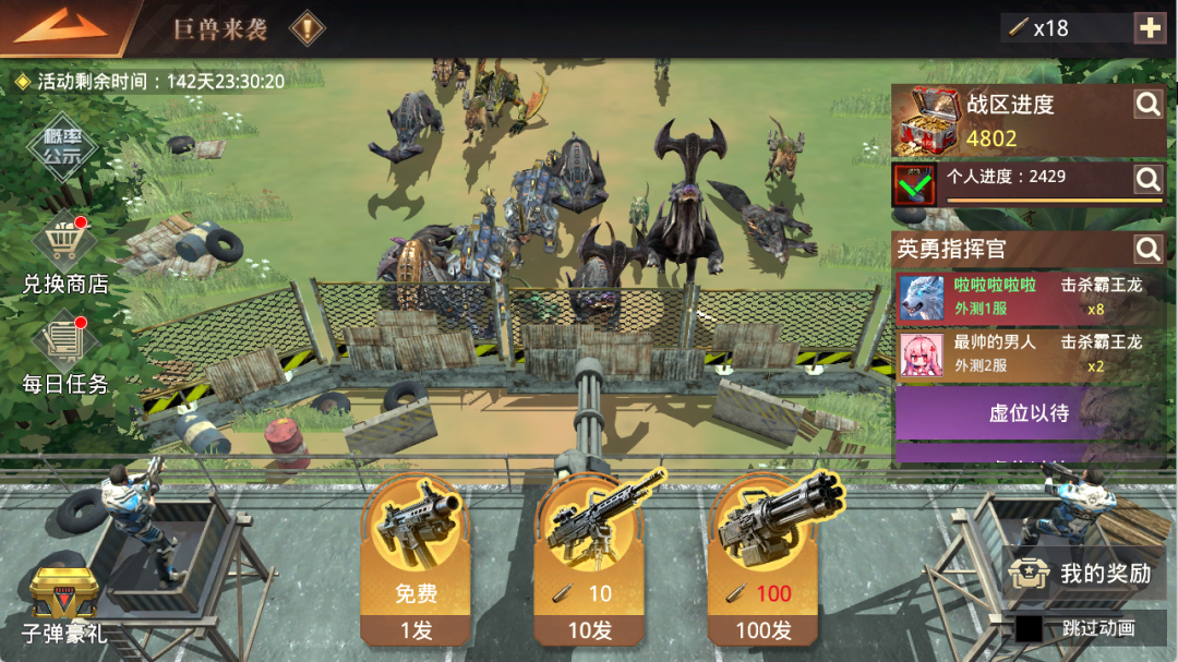 1、完成每日任务与购买礼包可获得大量【子弹】,消耗子弹可击杀巨兽获得随机奖励