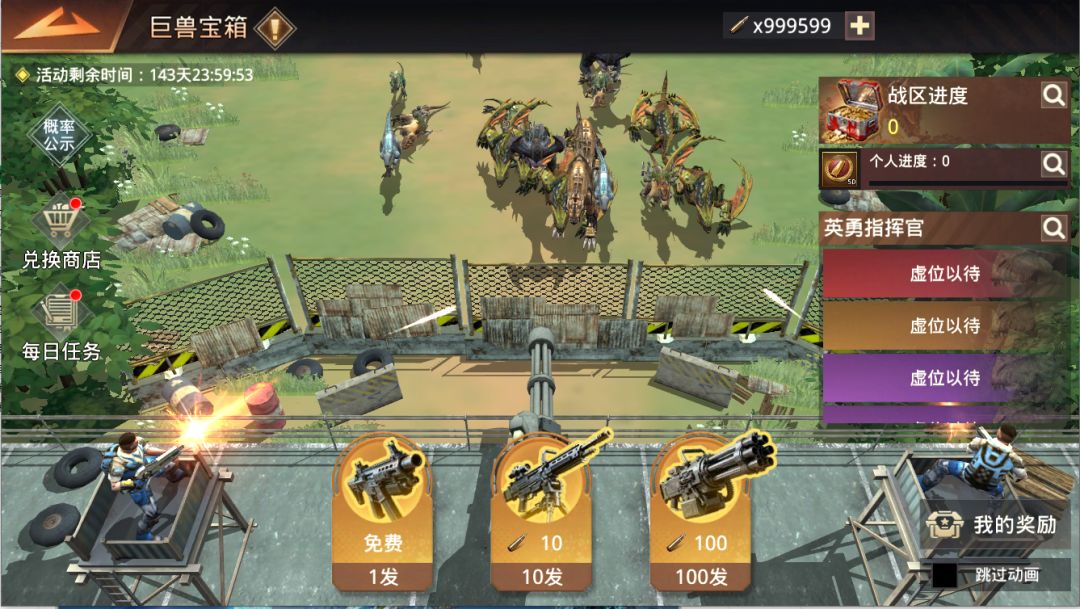 1、完成每日任务与购买礼包可获得大量【子弹】,消耗子弹可击杀巨兽获得随机奖励