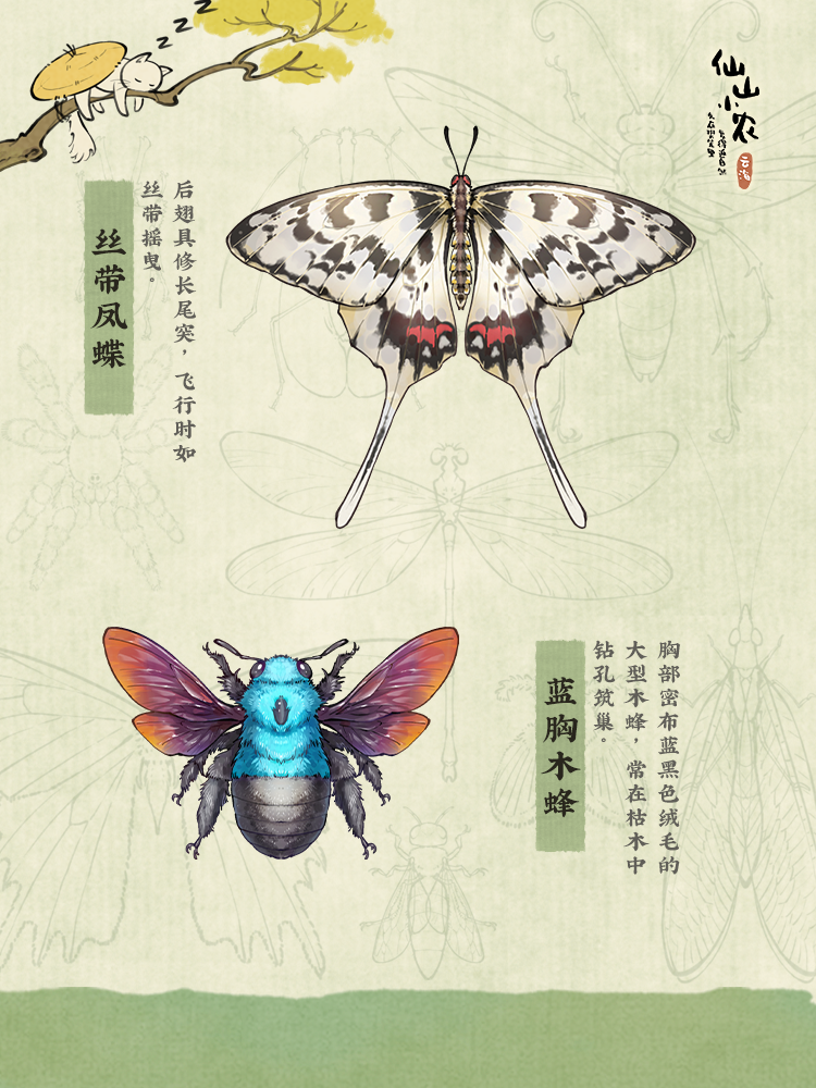 🦋新增虫类「丝带凤蝶」和「蓝胸木蜂」。