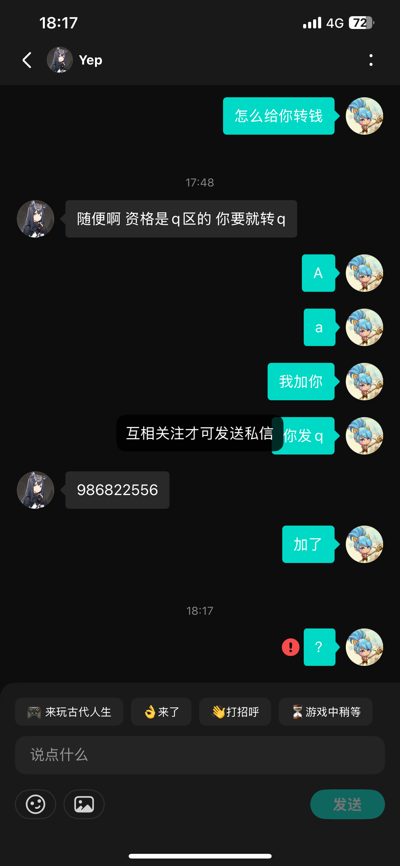 想买个万象棋资格,结果让骗了10块钱,大家注意不要让这个人骗了,估计骗子挺多