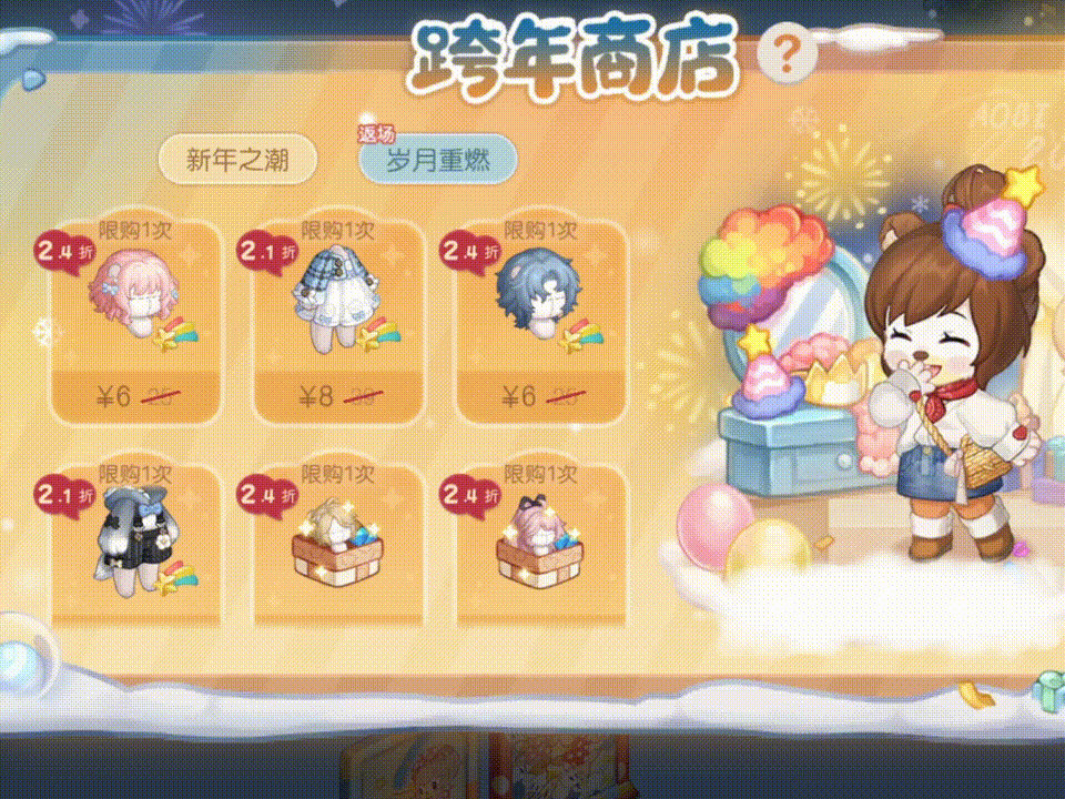 活动期间,小奥比们可在【新年之潮】小店中购买「剪纸裁梦裙特惠」、「纸鸢飞高高特惠」主题服饰礼包及氛围道具。同时,往期活动的「甜蜜卷发特惠」、「甜蜜千金裙特惠」、「乖萌高马尾特惠」、「心动双马尾特惠」等折扣礼包也将在【岁月重燃】小店中返场哦!