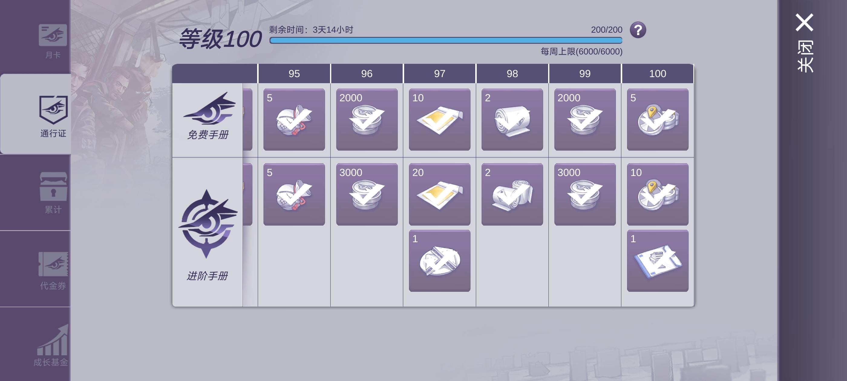 以上的98的周通行证,月卡以及月通行证如果你都想一直买且不被劝退的话,就可以开始接着吃史了。