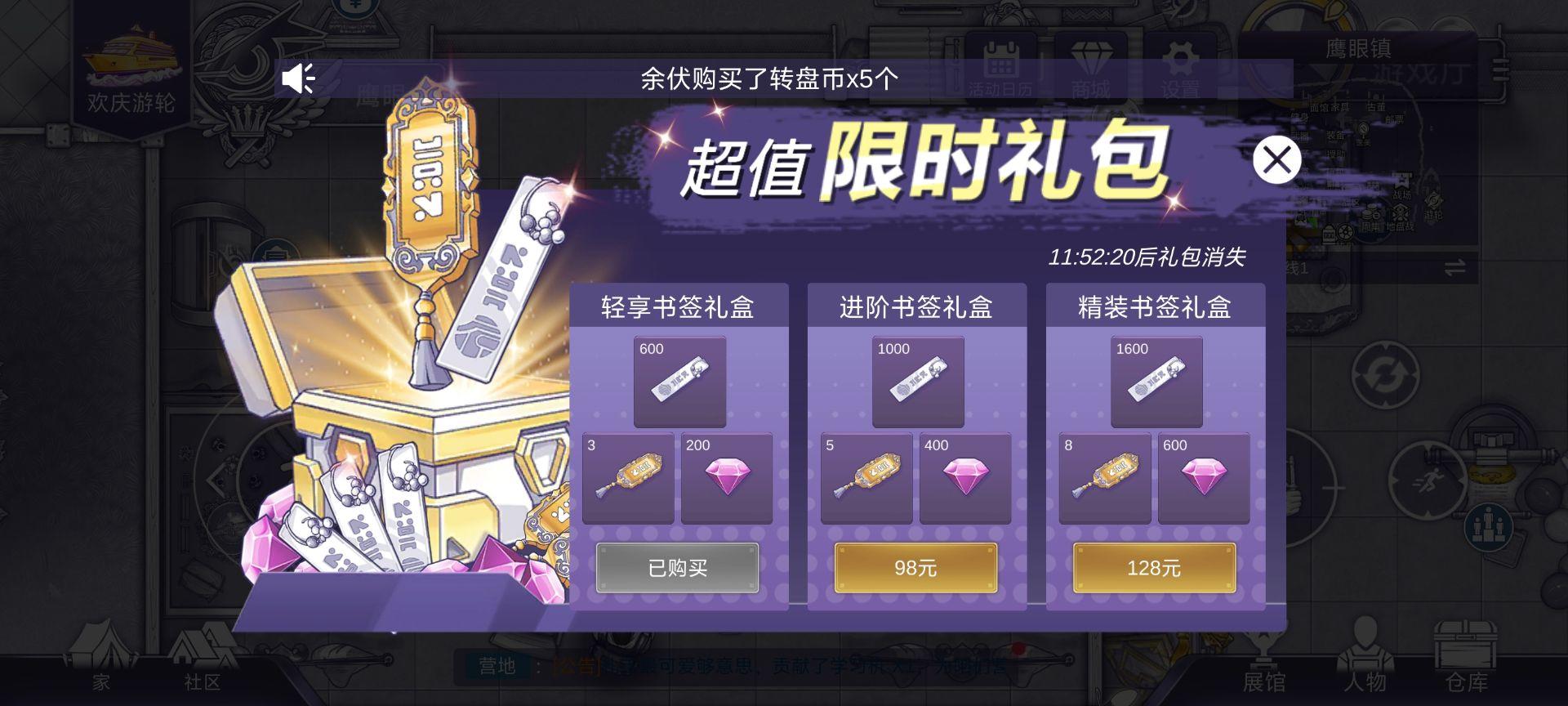 唯一值得购入的常驻礼包只有这个30的轻享书签礼包,他是性价比最高,最划算的常驻礼包。同时金书签也是目前游戏里提战力最好的道具 而且金书签的获取途径与数量有限。
