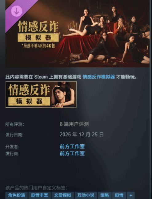 国产影游《情感反诈模拟器》发布公告,官宣4K画面升级包正式上架 Steam 商店,该升级包为免费DLC!过去半年里,官方始终稳步优化游戏,一边全力修复各类BUG,一边持续新增游戏内容,同时从未搁置4K升级计划,只是研发过程中遭遇不少困难。这款4K升级包体积高达104GB,不仅下载耗时较长,还需占用大量存储空间,且升级后画面存在模糊与噪点问题,可能影响游玩体验。