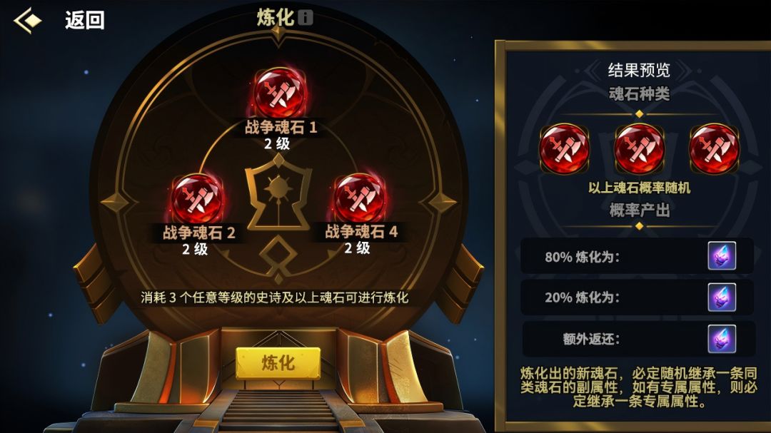1、消耗3个任意等级的史诗及以上魂石可进行炼化。有几率炼化为1个更高品质的魂石。炼化结束时魂石变为1级,并返还大部分升级材料。