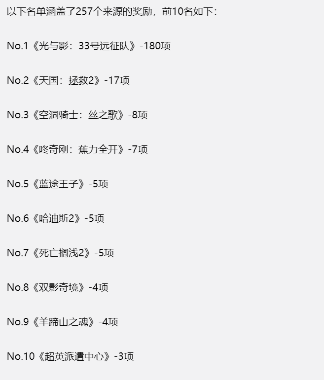 《光与影》夯爆了,狂揽180个年度大奖!是第二名10倍!