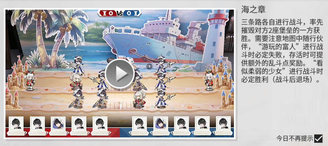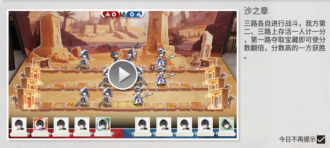 乱斗剧场本质是一个团体合作互相对抗的活动,每个团队需满足五位唤醒者,随后唤醒者们进入不同的章节应对不同的规则做出不一样的排兵布阵,参与活动无论胜负皆可完成每日任务获取点数及钻石等丰厚的奖励!累计点数达到一定数目即可上升段位获得额外奖励,玩法结束时还会根据点数结算一次排名奖励。