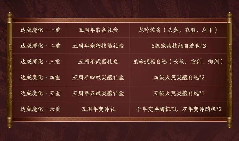 除了八万年尸鲲元胎,1月6日周年庆版本上线后,鲲鲲还准备了更多丰厚的五周年庆生礼物,大家也可以通过完成简单活跃任务就能领取到!龙吟的装备武器、五级四级灵蕴助你追赶大部队,还有五级宠物技能书*3、变异临时、120颗蓝蛋更快宠物养成!