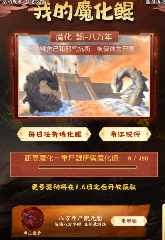 绘制完成后,可以在本活动内提前“培养”自己的鲲鲲到“八万年”,只需要完成非常简单的任务~当魔化值累计解锁到“八万年”阶段后,即可解锁八万年尸鲲元胎的领取资格,在1月7日0点就可以领取到游戏内了!