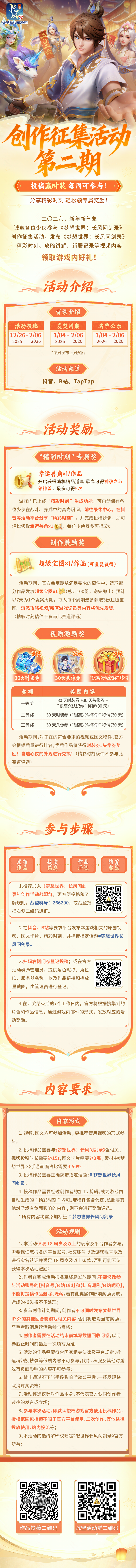 《梦想世界:长风问剑录》第二期创作征集活动开启!在抖音、哔哩哔哩等指定平台,发布《梦想世界:长风问剑录》相关视频或图文并按要求完成投稿,有机会获得时装兑换券、头像秀兑换券、限定称谓、超级宝图等好礼!