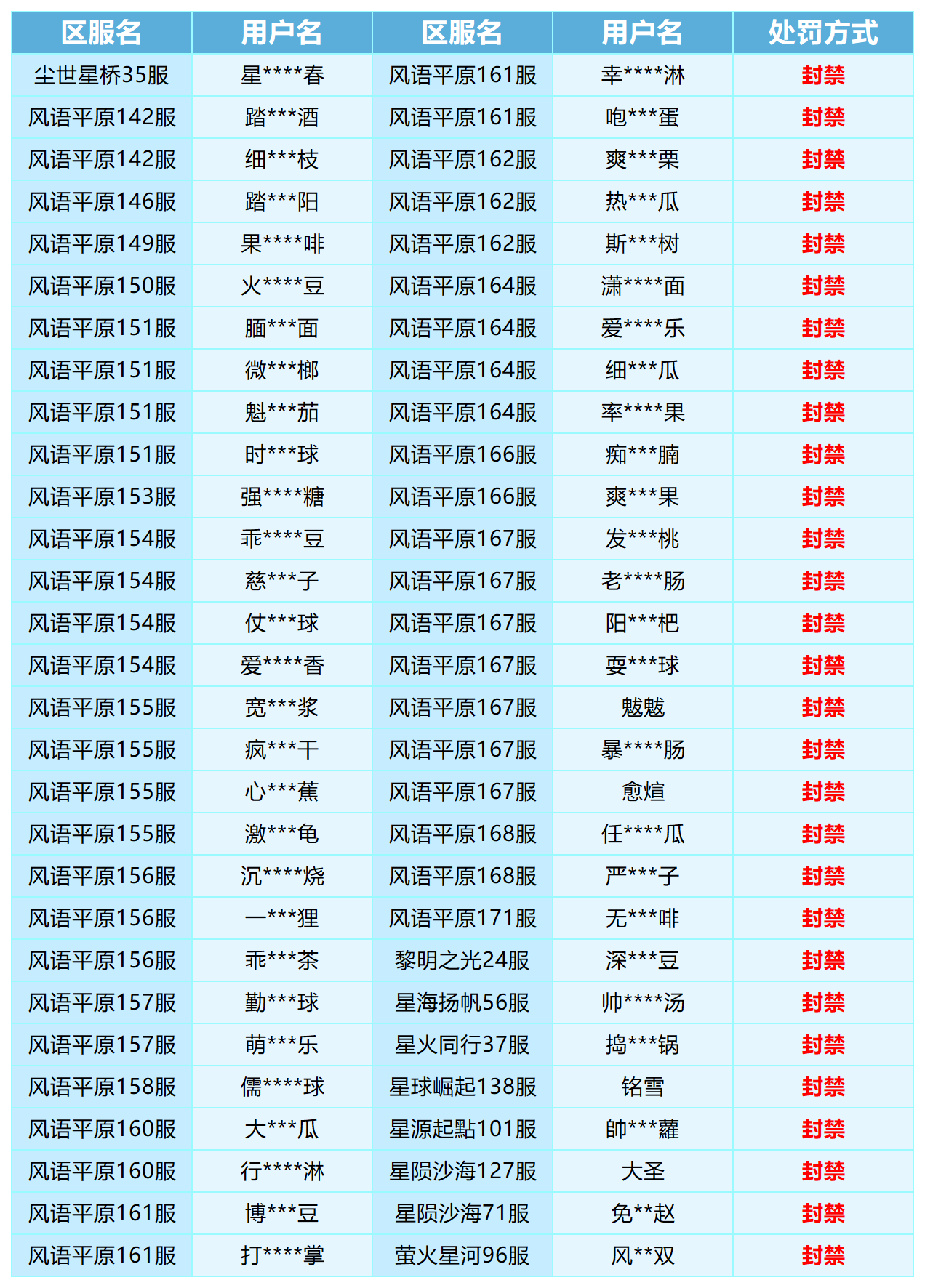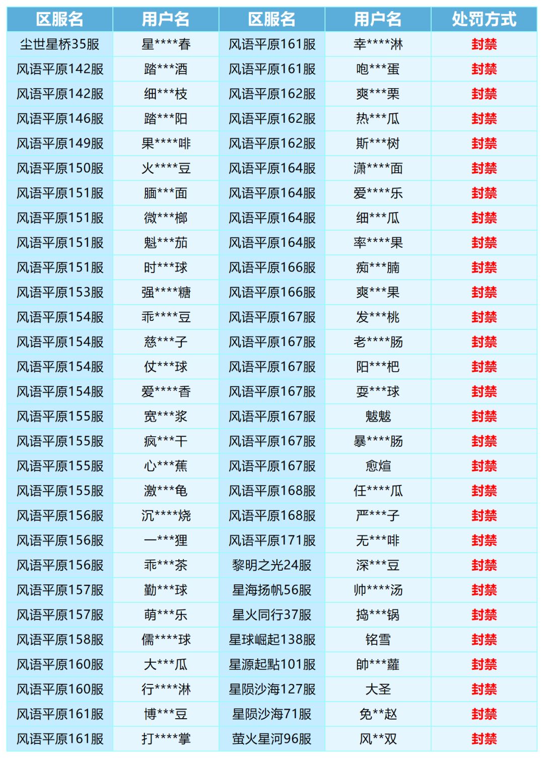 12月18日12:01至12月25日12:00期间,封禁名单公示: