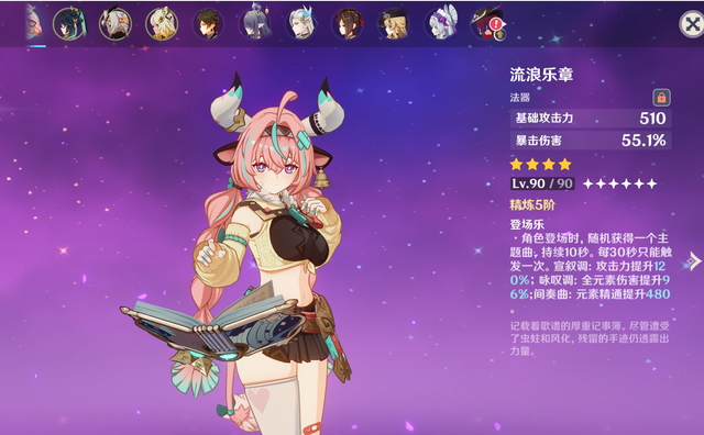 如果是4星的话,首推流浪乐章。不过,值得注意的是,武器效果“摇”到精通的时候,输出效果会大打折扣,只有元素伤害和攻击力对瓦蕾莎有提升。