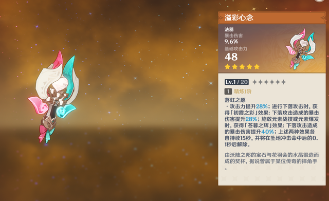 除此之外,由于瓦蕾莎还能打下落攻击,所以,闲云的专武“鹤鸣余音”也能用,提供大额百分比攻击力的同时,还能提升下落攻击伤害,以及元素能量回复,能够更好的提升瓦蕾莎的循环,变相提升DPS。