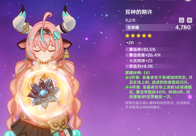 最佳选择为:长夜之誓4件套,退而求其次可选:黑耀秘典4件套,沙漏、杯子、头主词条推荐,攻、雷、暴,或者攻、攻、暴都行。副词条推荐,双暴>攻击力%>元素充能。