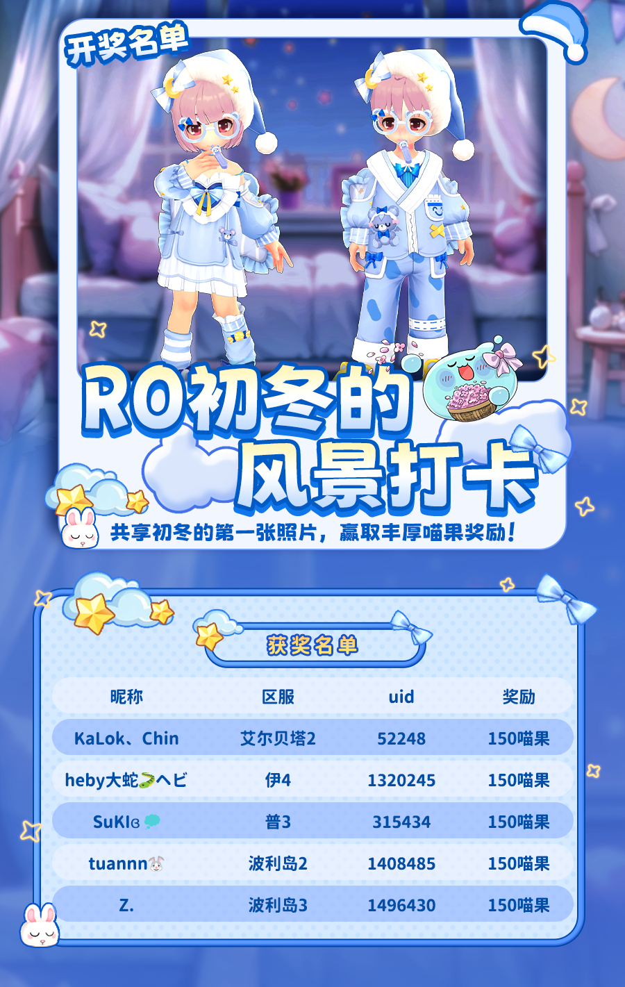 *游戏内道具奖励将在公示后30个工作日内发放至中奖冒险者提供的UID游戏内邮箱。没上榜的冒险者也不要气馁,关注【仙境传说RO爱如初见】公众号,获取后续更多活动信息~说不定下次拿奖的冒险者就是你