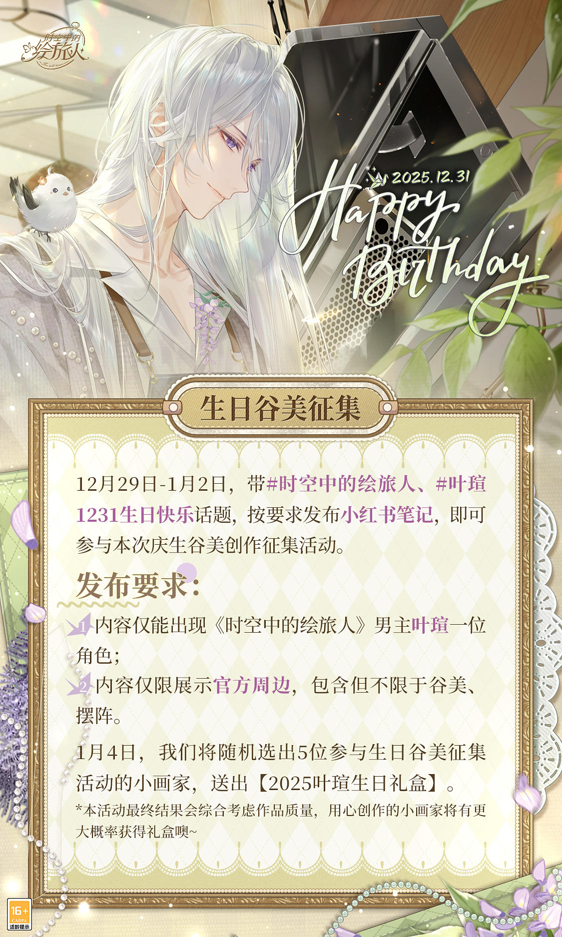 🎉《时空中的绘旅人》携手微博游戏、游戏超话社区 推出特别庆生系列活动。叶瑄生日到来之际,与他共度新一岁的生日吧~