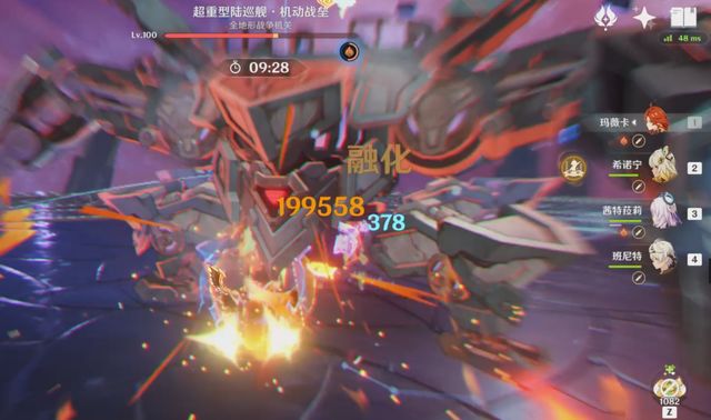 先是第一阶段,用火元素角色攻击,攒血条下的“高热值”,然后,又用火破盾,一来二去,一分钟的时间都过去了。