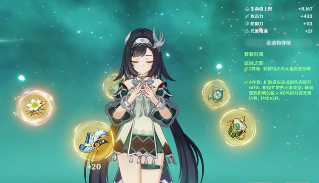 与此同时,你再给蓝砚带上翠绿之影四件套,套装效果可以减少水、火、雷、冰4种元素抗性,此时,蓝砚又晋升成集减抗、增伤、护盾于一体的功能辅助了。