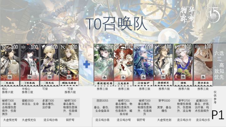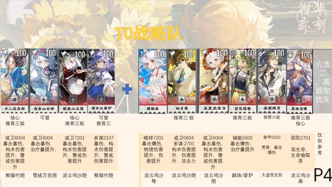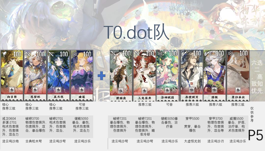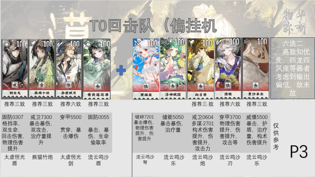 曾经的挂机之神,平民玩家的福音迎来了焕彰。推荐三致知焕彰玩家使用,总体来说相较于多动症体系,输出偏弱但生存压力很低可以搭配6931和当期限定赤壁赋页补输出。同样更容易应对3+3分散站位。或者使用向日葵都可以缩短挂机时间。