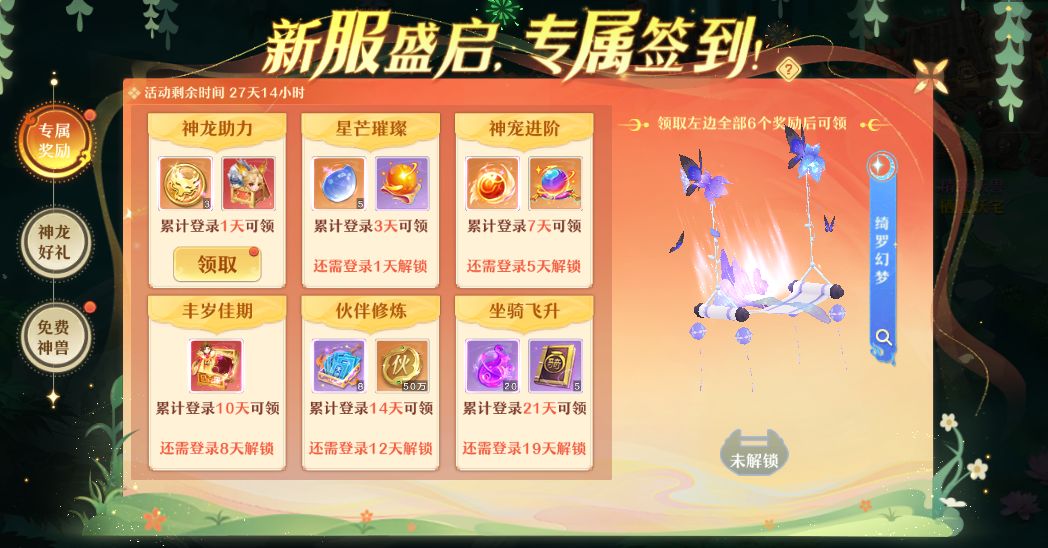 2026新服限定!登录首日就送神兽机缘匣,累计登录7天送神兽元灵,10天送【丰岁佳期·30天】、永久头像框。