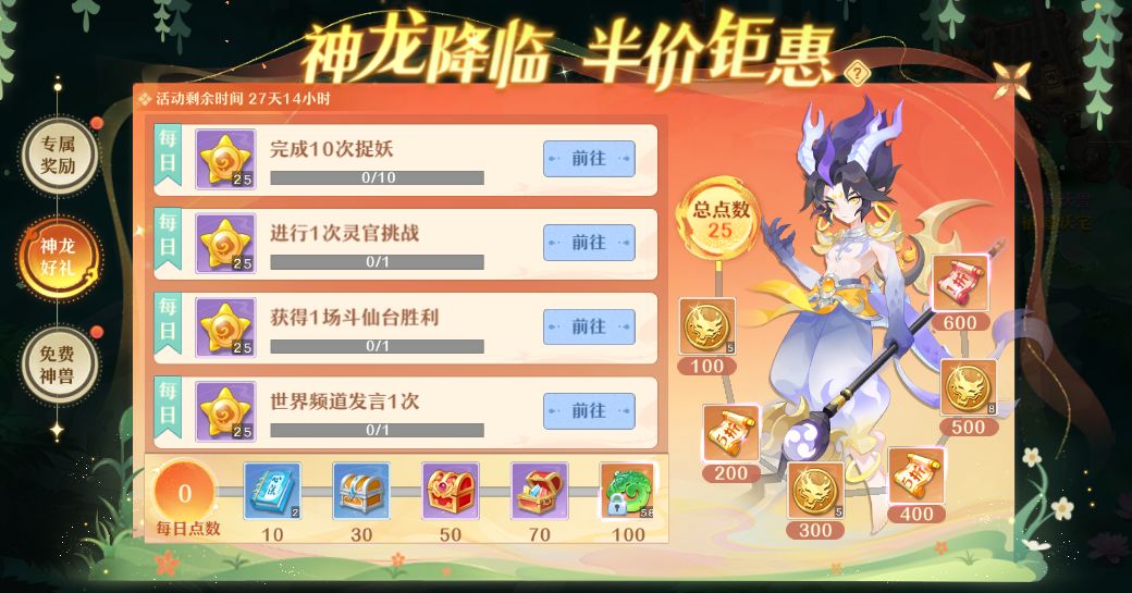 完成每日任务,领取限定奖励!最高可得【神龙奖励·1折券】,使用折扣券后可以使下次神龙降临十连抽奖价格打一折!